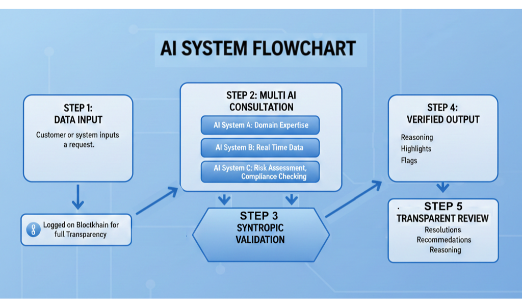 When a customer or system submits a request, Syntropic AI orchestrates multiple specialized AI systems—each bringing domain expertise, real-time data, or risk assessment capabilities. But instead of sending conflicting recommendations directly to your users, Syntropic's validation layer analyzes all outputs simultaneously.